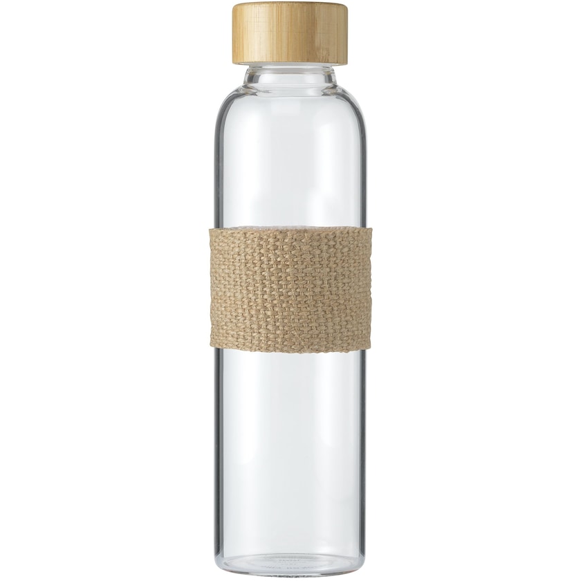 Vattenflaska av tåligt borsilikatglas. Vattenflaskan är försedd med bambulock och är helt läckagesäker. Tas locket bort kan flaskan köras i diskmaskin. Levereras individuellt förpackade i en brun papplåda. Tryck kan ske med maximalt två färger.