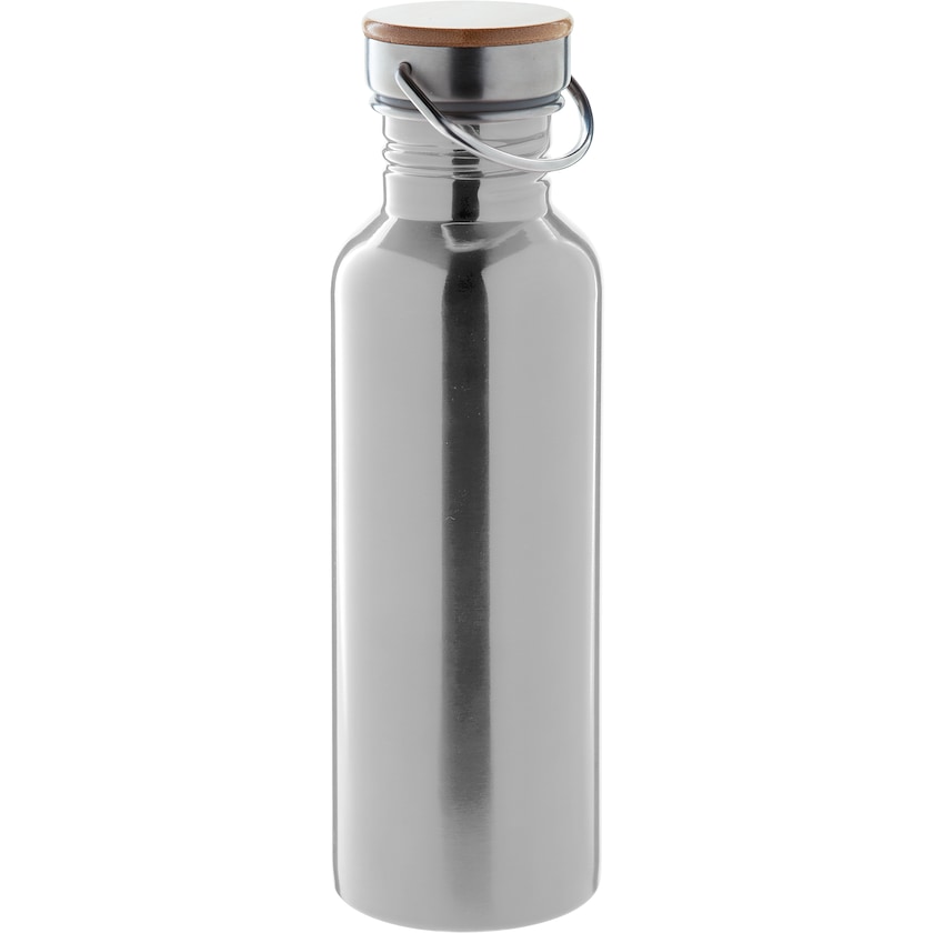 Vattenflaska av rostfritt stål med praktiskt bärhandtag i locket. Lockets ovandel är gjort av vacker bambu. Märkning kan antingen ske med tryck eller lasergravyr.