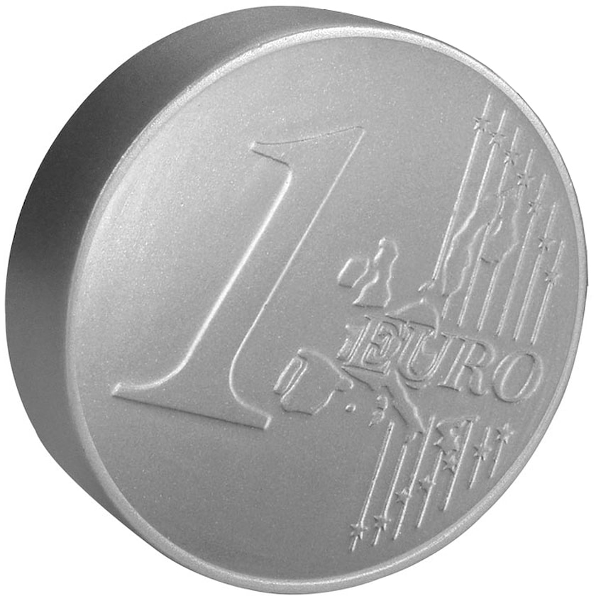 Stressboll i form av ett 1-euromynt. Trycket sker på myntets baksida.