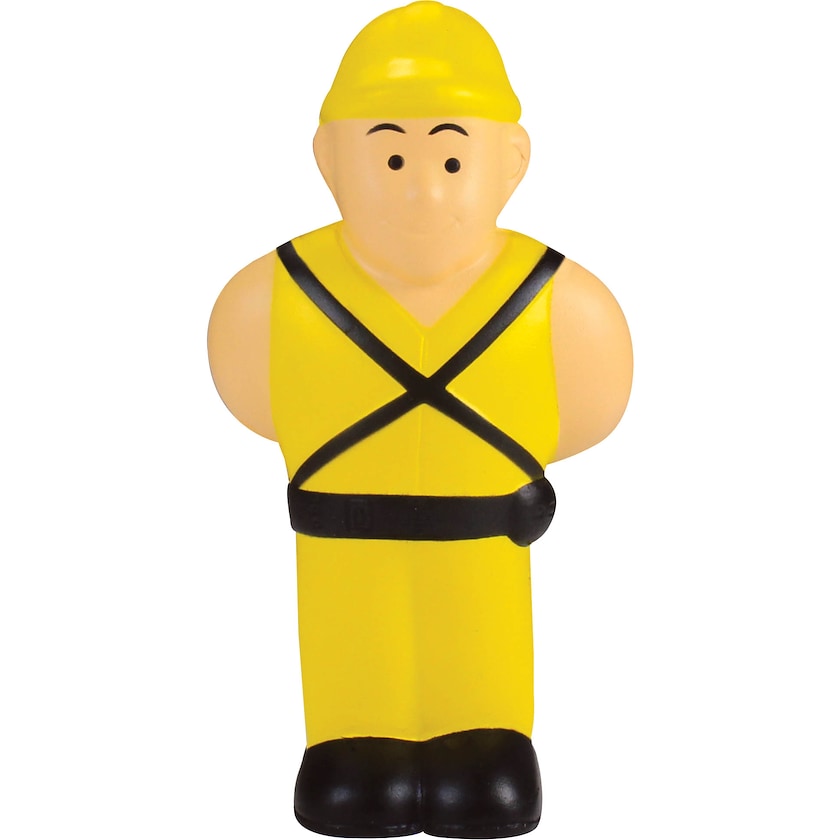 Stressboll designad som en byggnadsarbetare. Trycket håller högsta möjliga kvalitet och klarar lång tids knådande.