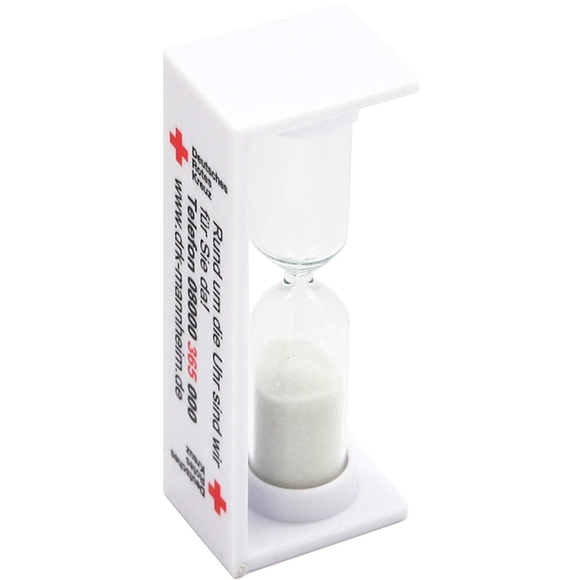Håll koll på tandborstningen! Litet timglas med tryck. Timglaset rinner igenom på ca 2 minuter. Kan tryckas i högst två färger.