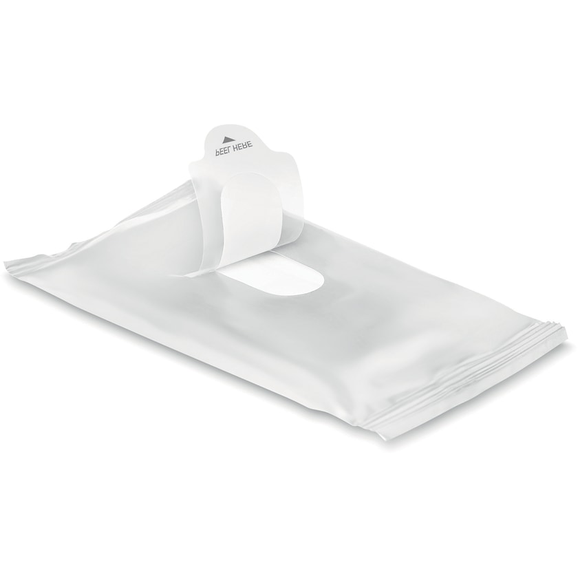 Våtservettförpackning med 10 st våtservetter. Märkning sker med en digitaltryckt etikett.