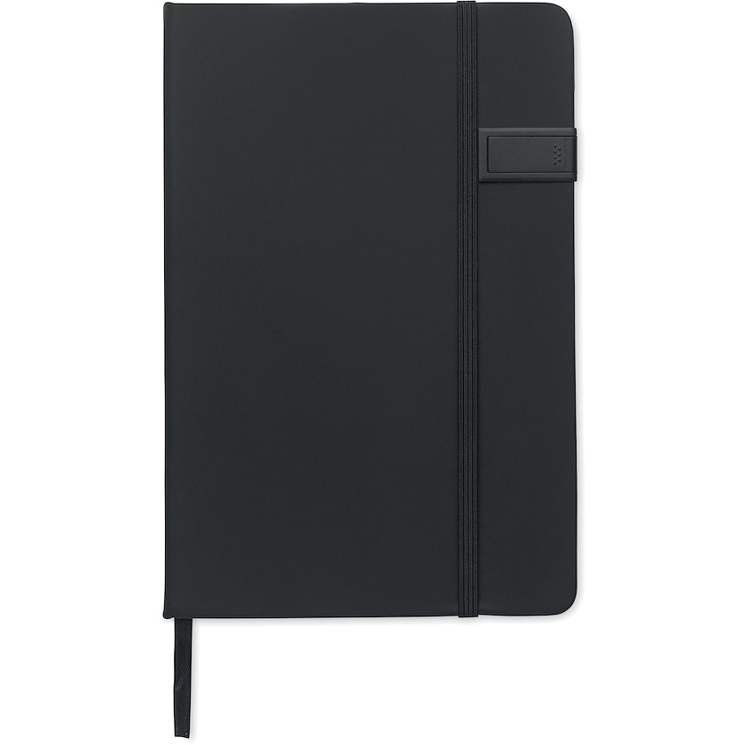 Anteckningsbok med ett 16 GB USB-minne. Anteckningsboken har hårt omslag och inlaga som består av 80 linjerade blad av återvunnet FSC-märkt papper. Omslaget är delvis gjort av återvunnet material.