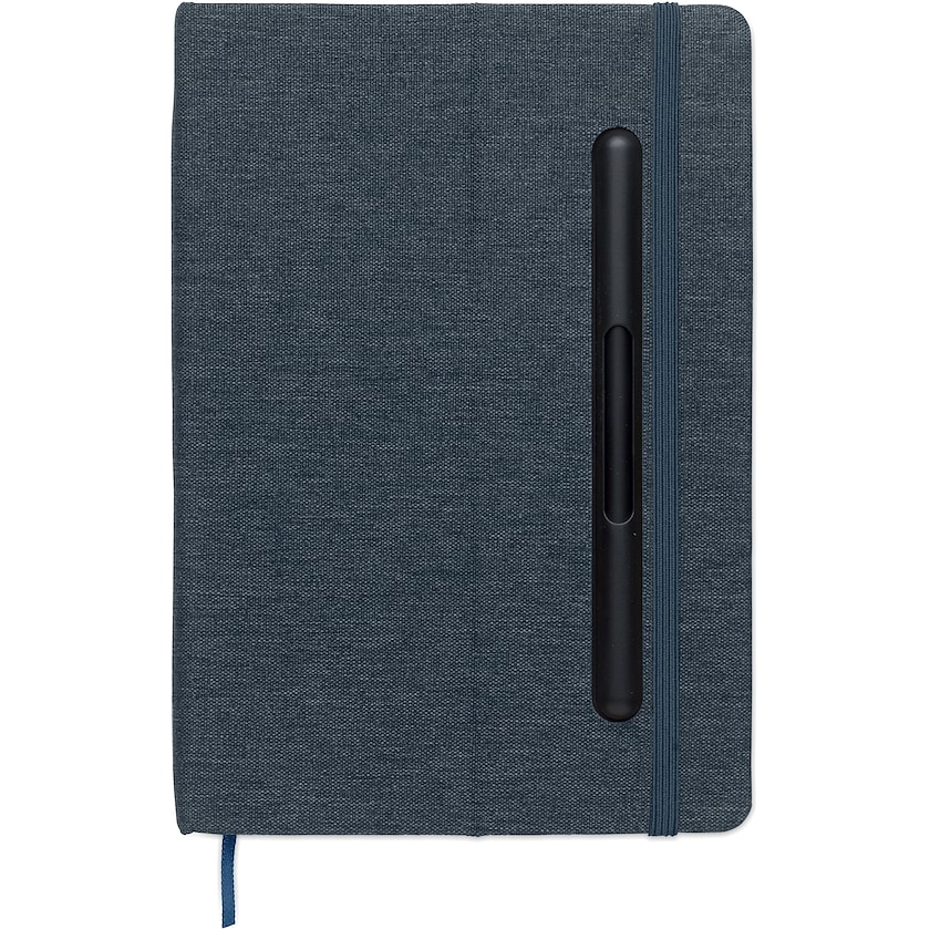 Skrivbok med penna samt stöd för mobiltelefon. Skrivbokens hårda omslag är gjort av miljövänlig rPET. Inlagan består av 96 linjerade blad av FSC-certifierat återvunnet papper. Pennan har både bläckskrift och bläckfri skrift.