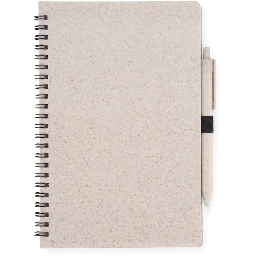 Miljövänlig spiralbok med penna. Omslaget och pennan är gjorda av miljövänlig vete-halm-plast och inlagan består av 70 rutade blad av återvunnet papper.