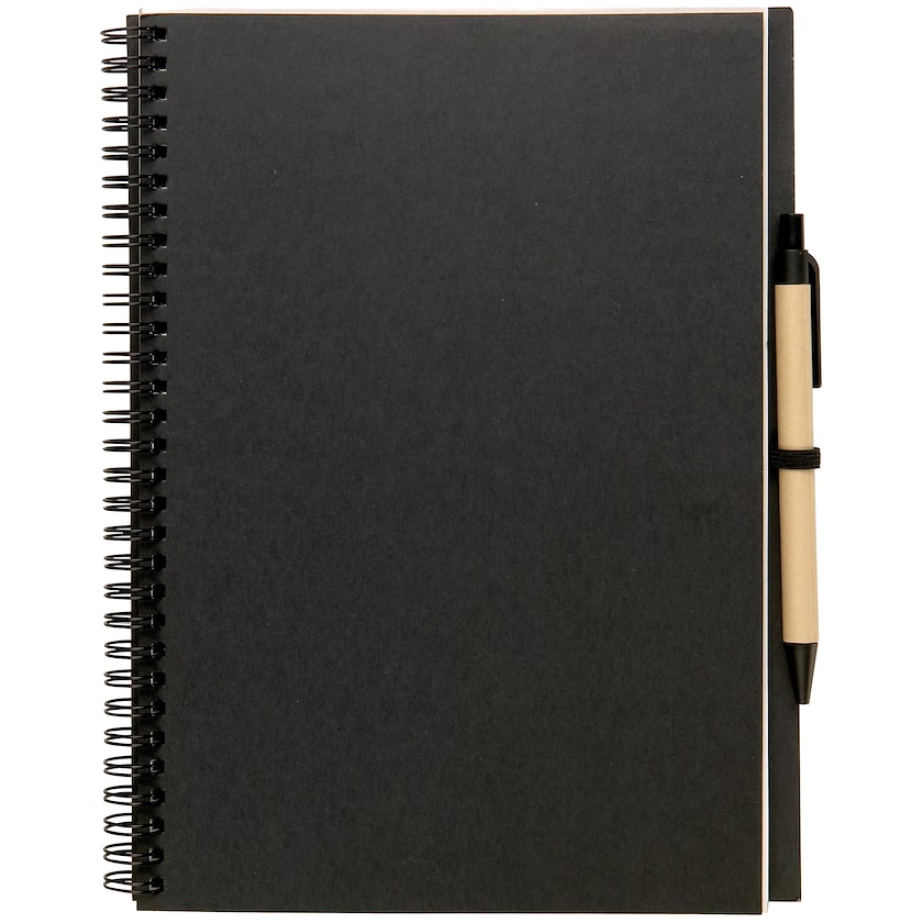 Miljövänlig spiralbok med penna. Boken har 70 olinjerade blad av återvunnet papper och pennan är tillverkad av återvunnet och biologiskt nedbrytbart material.