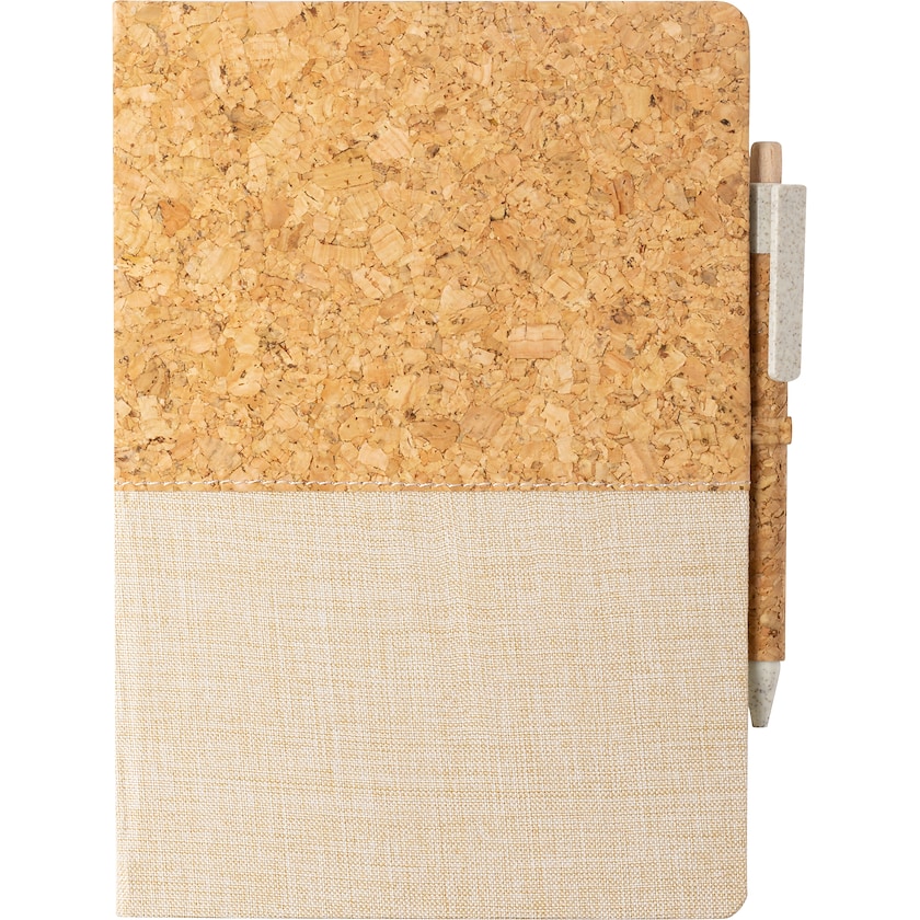 Skrivbok av bomull och kork. En penna tillverkad av kork samt en miljövänlig mix av vete-halm och plast medföljer. Tryckpriset avser tryck antingen på skrivboken eller pennan.