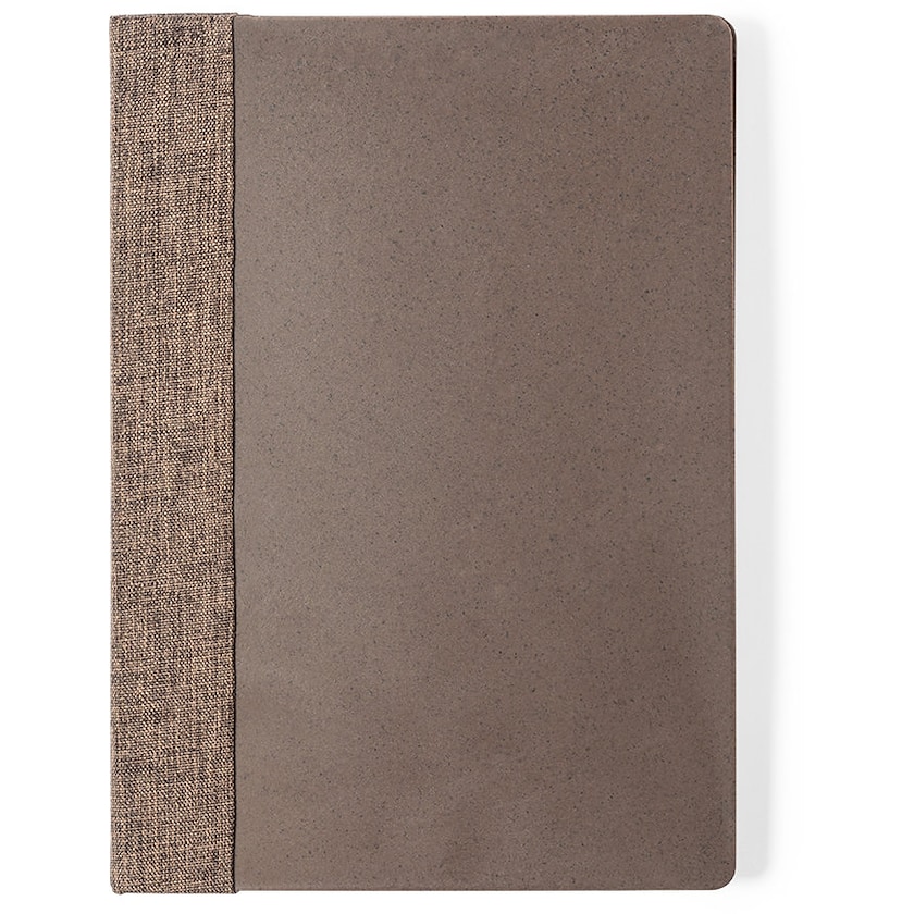 Miljövänlig skrivbok med omslag av kaffefiber. Inlagan består av 100 linjerade blad. På omslagets baksida finns förtryckt information om att det är gjort av kaffefiber.