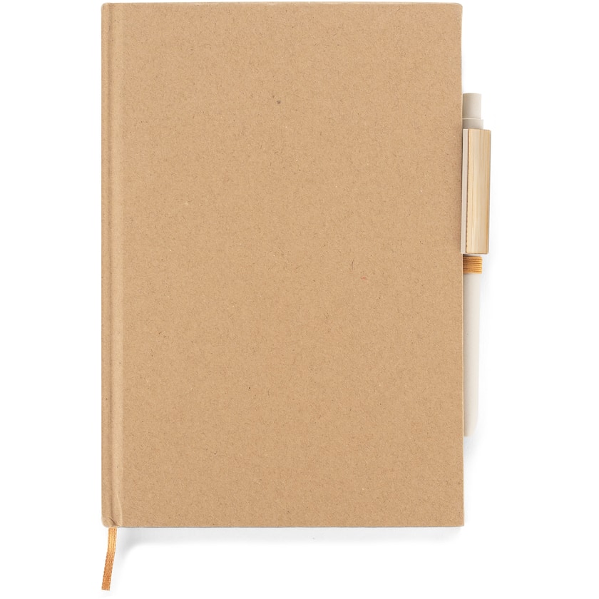 Naturfärgad skrivblok med tillhörande penna. Omslaget är tillverkat av hårdpapp och inlagan består av 80 blad rutat papper. Pennan är tillverkad av en miljövänlig mix av 50% bambu och 50% plast. Trycket kan antingen ske på skrivboken eller pennan.