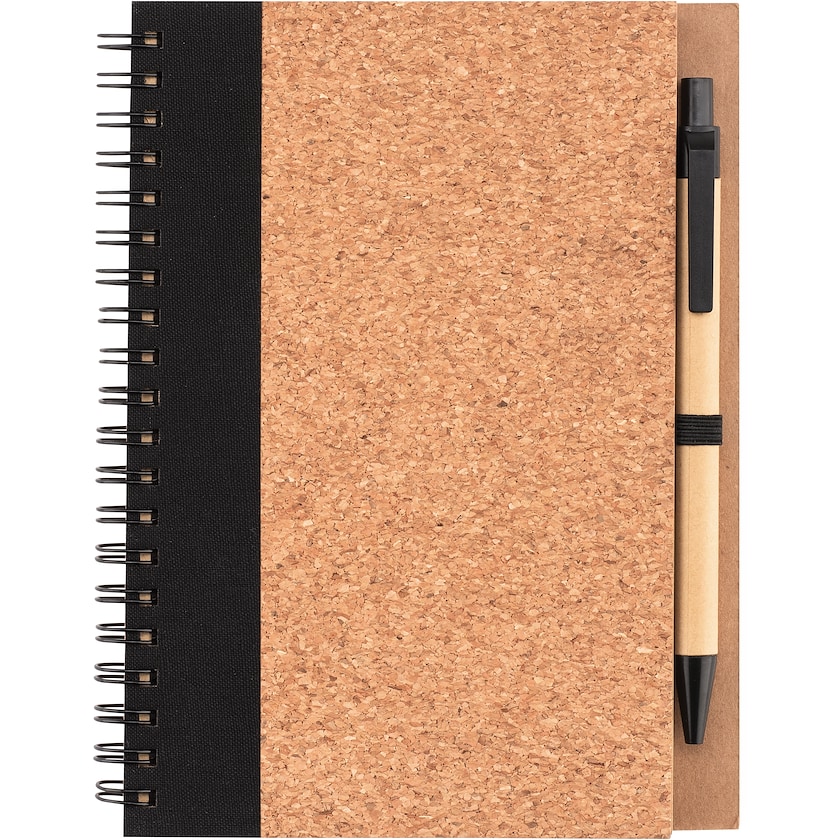 Miljövänlig spiralbok med tillhörande penna. Spiralbokens omslag är tillverkat av kork och har en inlaga av 70 linjerade blad av återvunnet papper. Pennan har svart bläck och är tillverkad av återvunnen kartong samt majsplast. Tryckpriset avser tryck på antingen spiralbokens omslag eller på pennan.