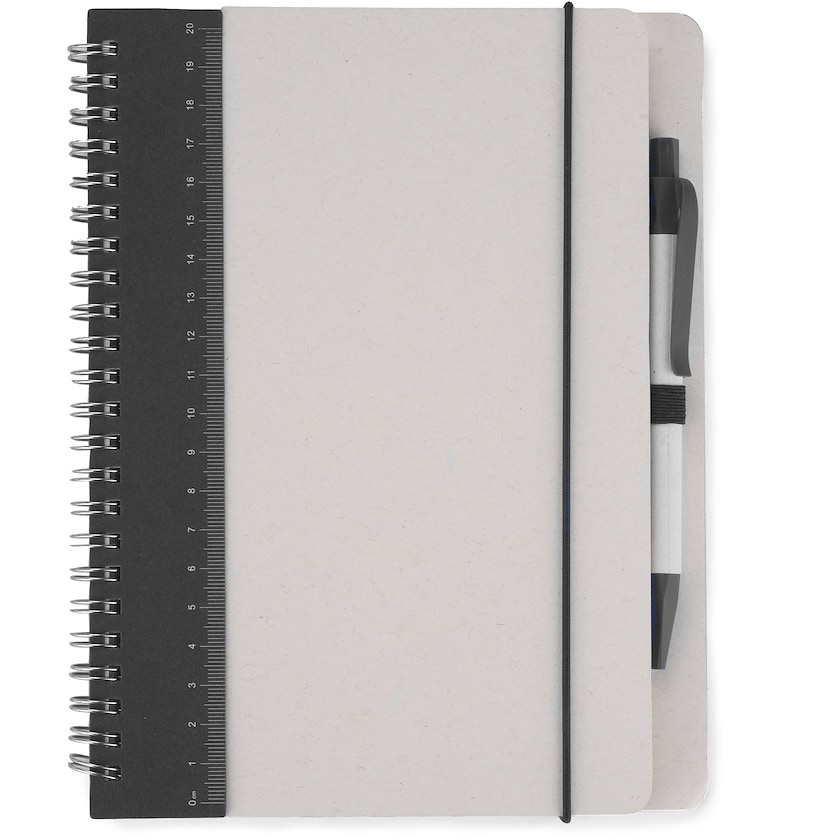 Miljövänlig spiralbok med linjal och penna. Spiralbokens omslag, linjalen och pennan är gjord av återvunna mjölkkartonger. Inlagan består av 70 linjerade blad.