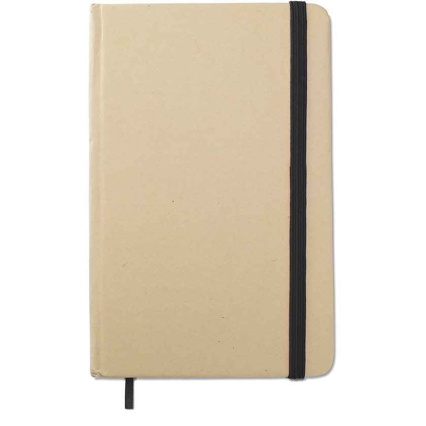 Skrivbok av återvunnet papper. Inlagan består av 96 olinjerade blad. Skrivboken är försedd med ett elastiskt band och en pennhållare.