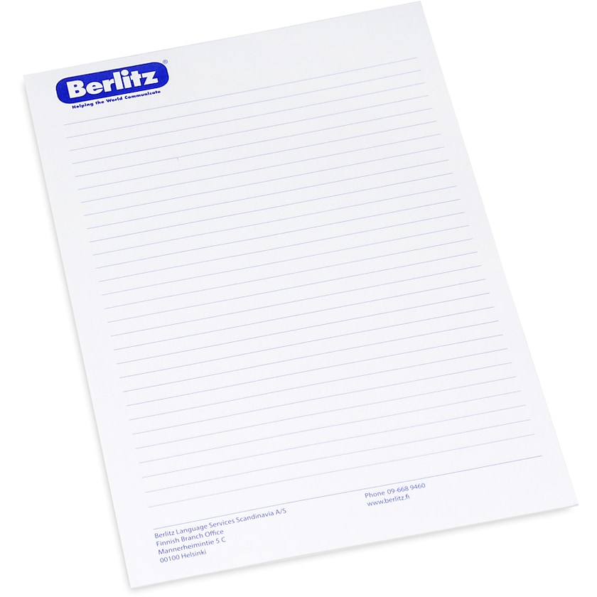 Limmat anteckningsblock i A5-storlek med eget tryck. Baksida är i kartong. Tryck i max fyra färger sker enligt Pantoneskalan och däröver i CMYK. Välj själv mellan 10, 20 eller 30 blad. Hela framsidan trycks efter dina önskemål.