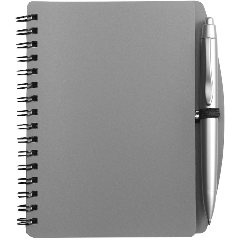 Skrivbok i storlek A6 med frostat omslag och medföljande penna.