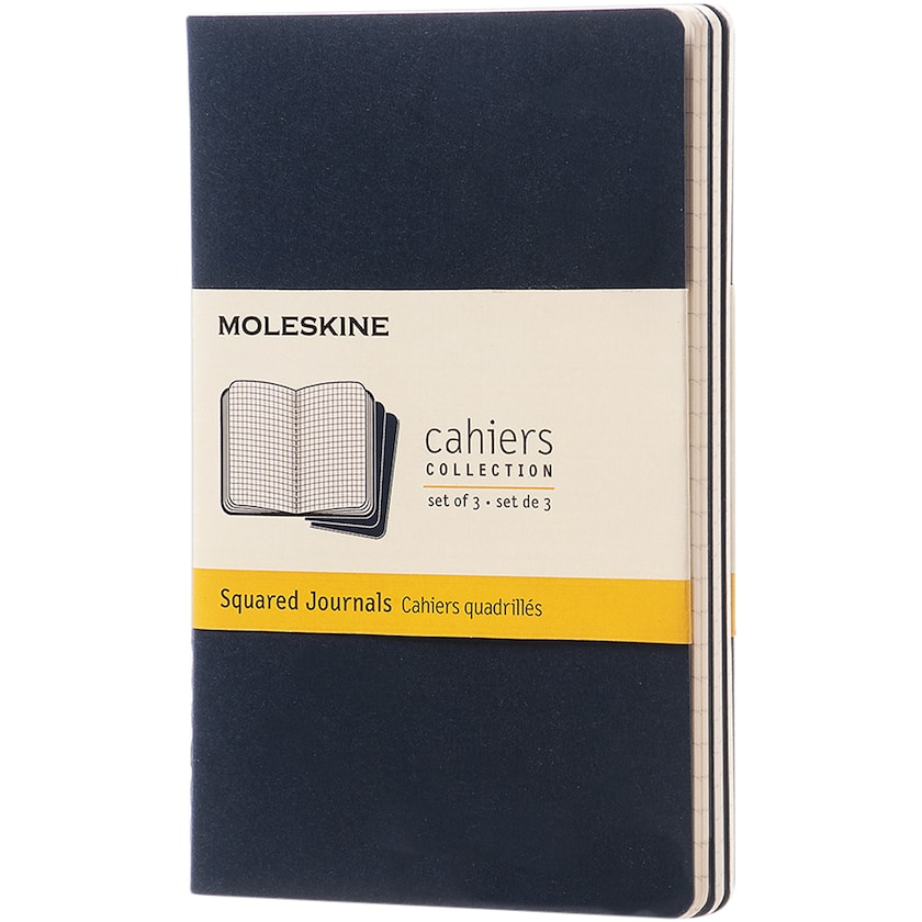 Rutat skrivhäfte från Moleskine. Skrivhäften har kartongomslag med synlig söm i ryggen. Bladen är elfenbensfärgade och rutade. De sista 16 bladen är löstagbara. Endast 1-färgstryck är möjligt.