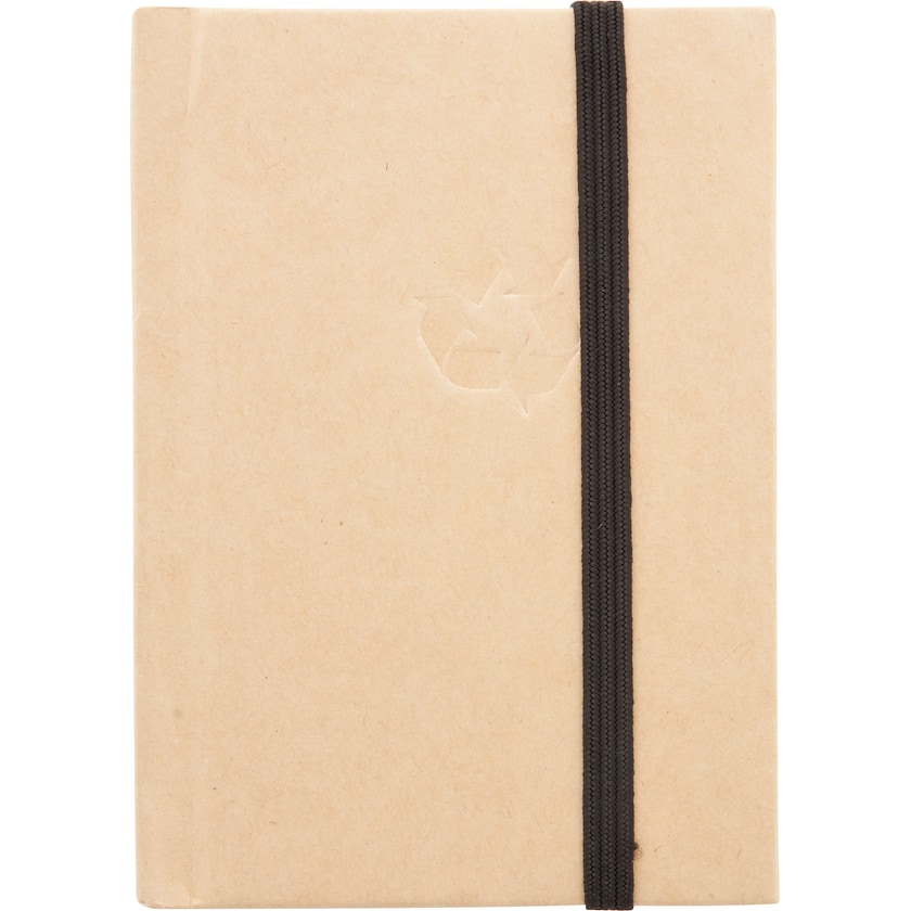 Miljövänlig skrivbok som är tillverkad av återvunnet material. På framsidan finns det präglat en återvinningssymbol.