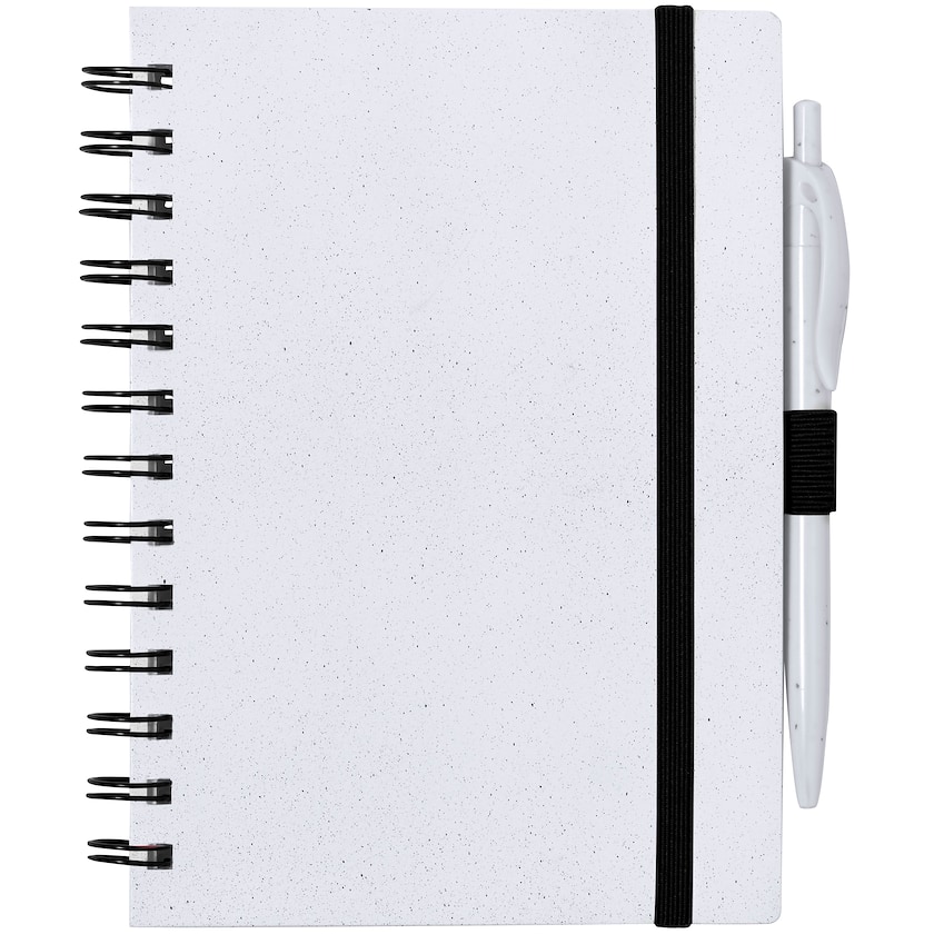 Spiralbok av återvunnet material. Omslaget är gjort av återvunnen ABS och inlagan av 70 linjerade blad av återvunnet papper. Penna är även den tillverkad av återvunnen ABS. Ett miljövänlig val.