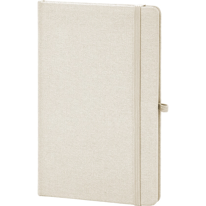 Skrivbok i A5-format av återvunnet material. Omslaget är gjort av återvunnen bomull och inlagan består av 80 linjerade blad av återvunnet papper. Skrivboken är försedd med elastiskt band, bokmärke och pennhållare.