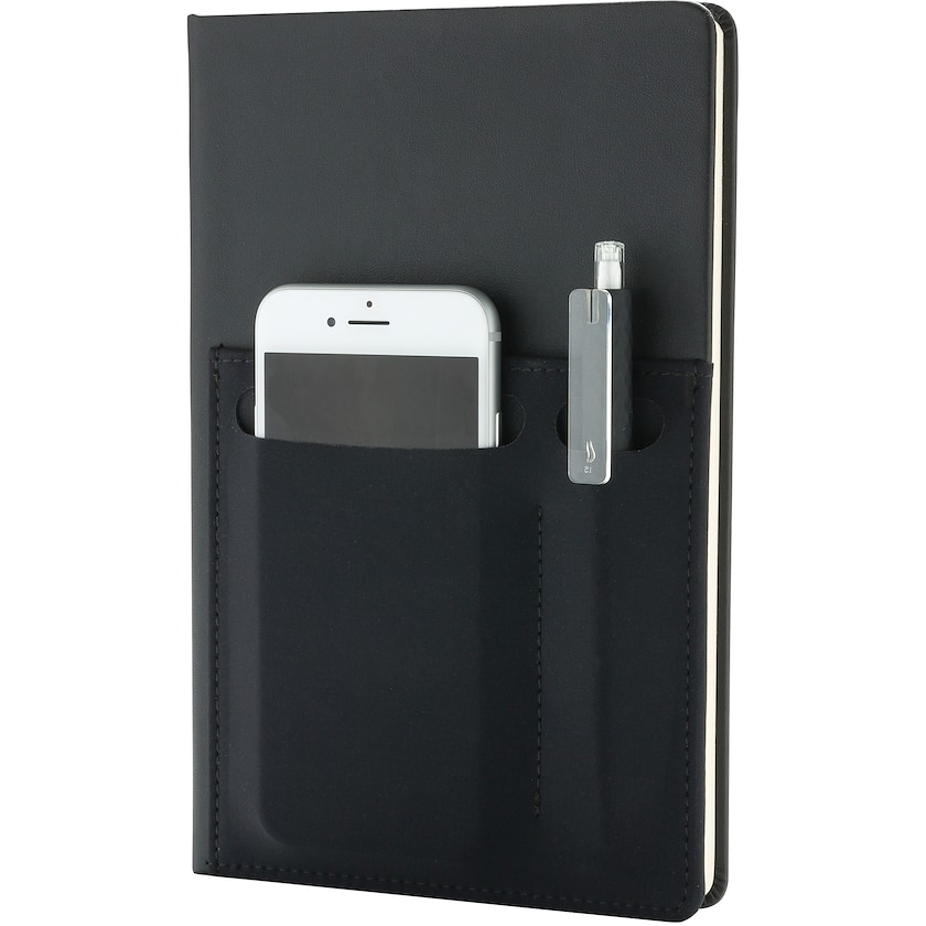 Skrivbok i A5-storlek med smarta fickor på framsidan. Fickorna på framsidan består av en flexibel telefonficka, en pennficka och en dokumentficka. Telefonfickan är 8 cm brett vilket gör att en iPhone 7 plus får plats. Skrivboken består av 80 linjerade blad i cremefärg.