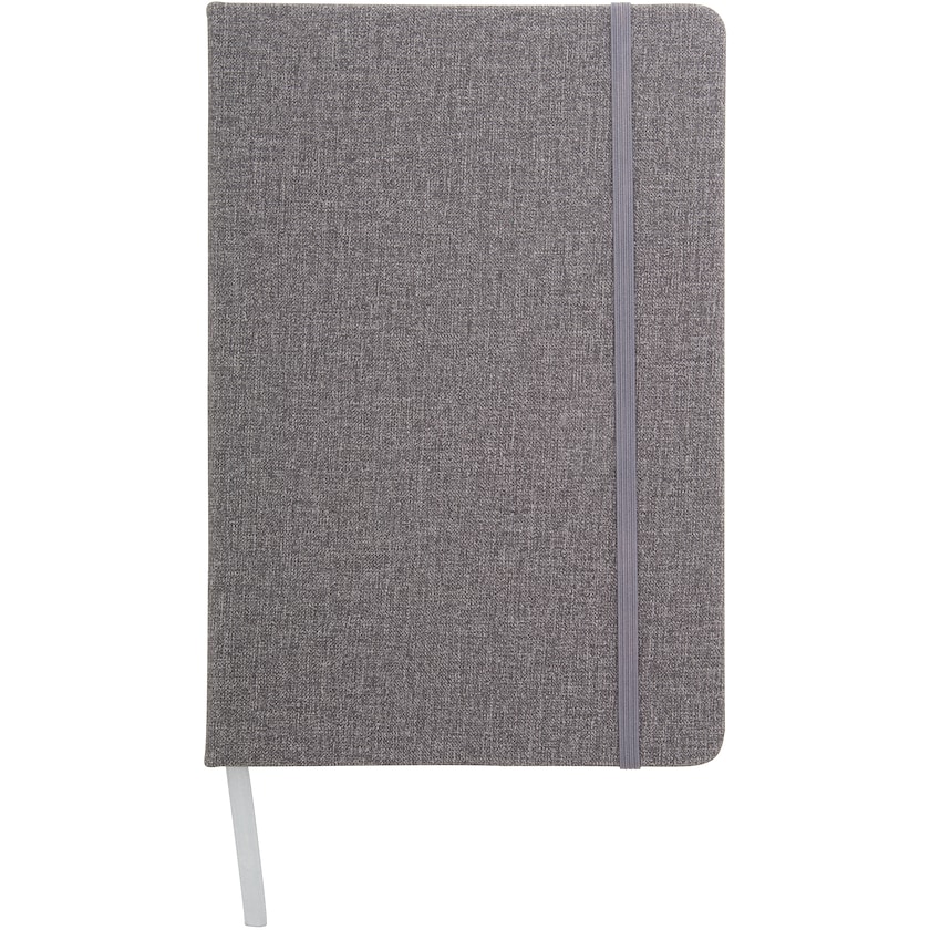 Skrivbok i A5-storlek med omslag av textil. Skrivboken har 80 linjerade blad och omslaget har ett elastiskt band som håller det boken stängd när den inte används. Tryck kan ske i maximalt två färger.