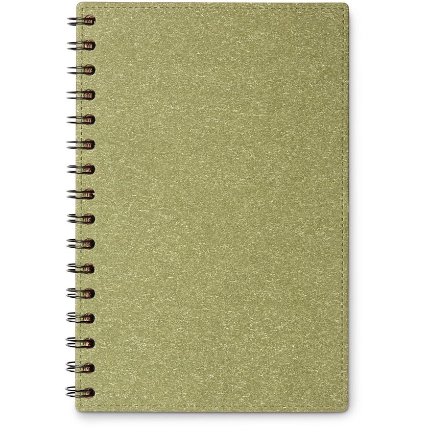 Spiralbok av återvunnet papper. Omslaget är hårt och inlagan består av 80 linjerade blad. Längst ner på varje sida finns en återvinningssymbol.