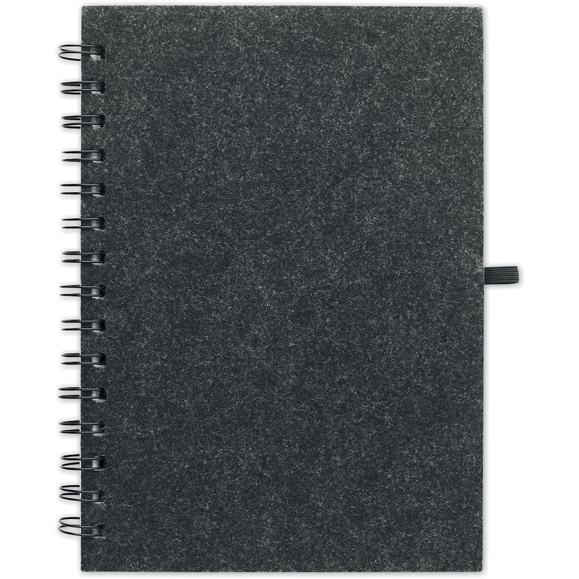 Miljövänlig spiralbok med filtomslag. Filtomslaget är tillverkat av rPET, dvs återvunna PET-flaskor och inlagan är tillverkat av återvunnet papper. På omslagets baksida finns en symbol som visar att den är tillverkad av återvunnet material.