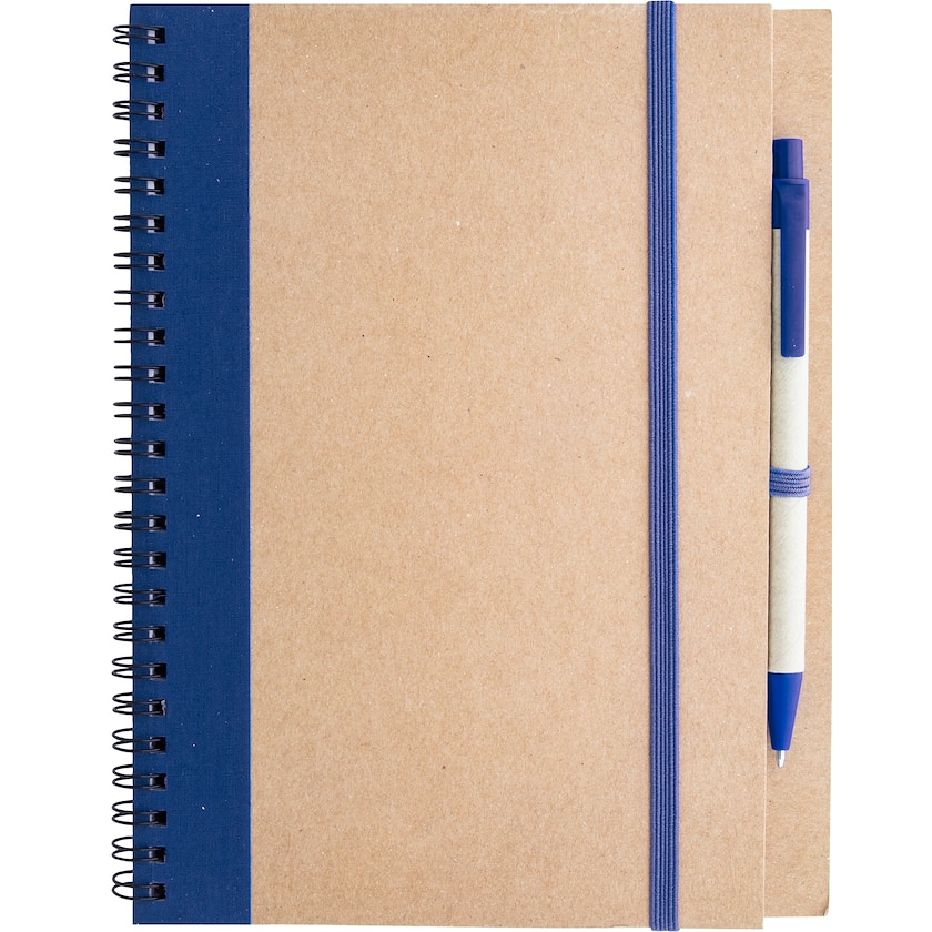 Klassisk, miljövänlig spiralbok inklusive kulspetspenna med blått bläck. Både bok och pennor är tillverkat av återvunnet material.