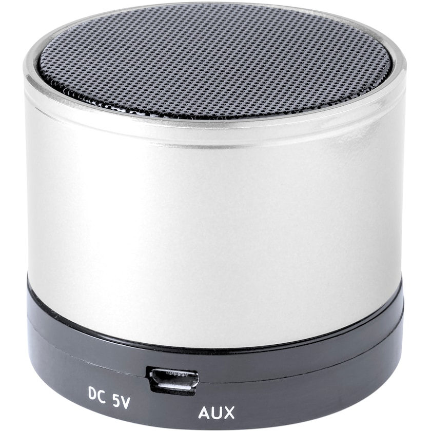 Rund bluetooth-högtalare av metall. Har ett flertal funktioner som radio, mp3-spelare och högtalartelefon. Märkning sker med lasergravyr.