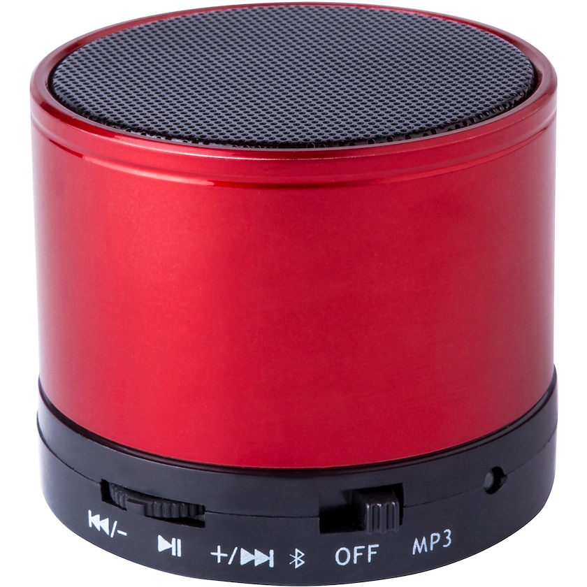 Rund bluetooth-högtalare av metall. Har ett flertal funktioner som radio, mp3-spelare och högtalartelefon. Märkning sker med lasergravyr.