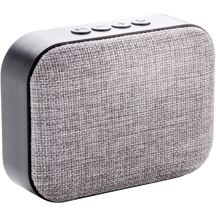 Modern Bluetooth-högtalare med framsida av grått tyg. Batteriet klarar upp till 3 timmars speltid på en laddning och ett avstånd från musikenheten på upp till 10 meter. Mikro- och audiokabel medföljer. Trycket sker på tyget på högtalarens framsida.