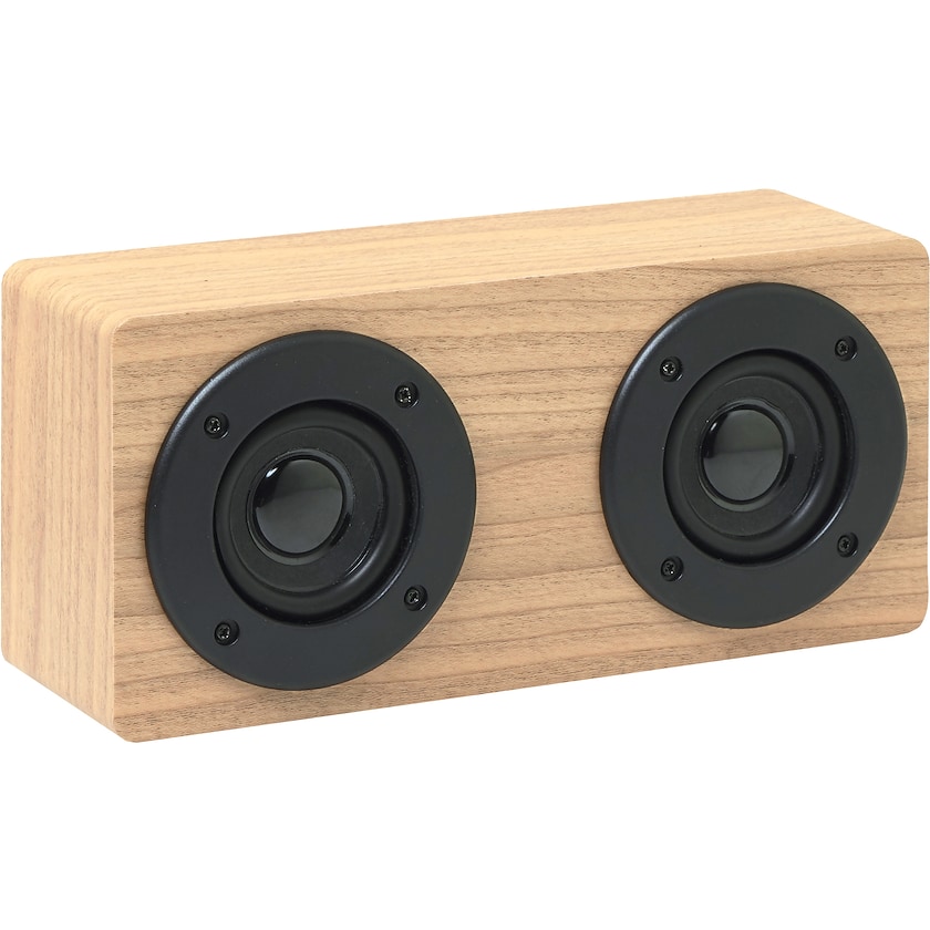 Bluetooth-högtalare med dubbla högtalare och inbyggd förstärkare. Högtalarens ytterhölje är tillverkad av trä. Märkning sker antingen med tryck eller lasergravyr på träet.