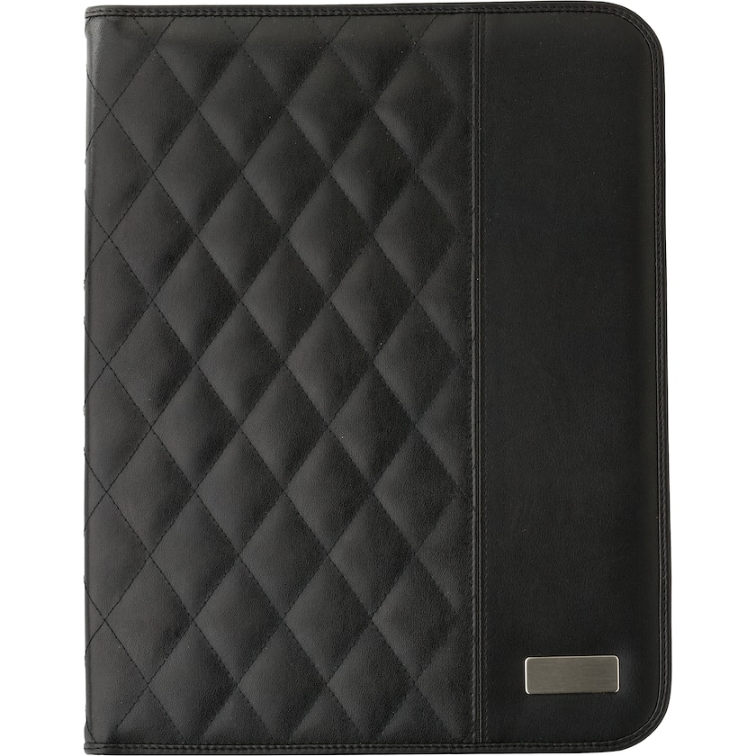 Påkostad konferensmapp med omslag av konstläder. Invändigt finns ett skrivblock med 25 linjerade blad samt flera fickor och pennhållare. Märkning sker med lasergravyr på metallplattan på konferensmappens framsida.
