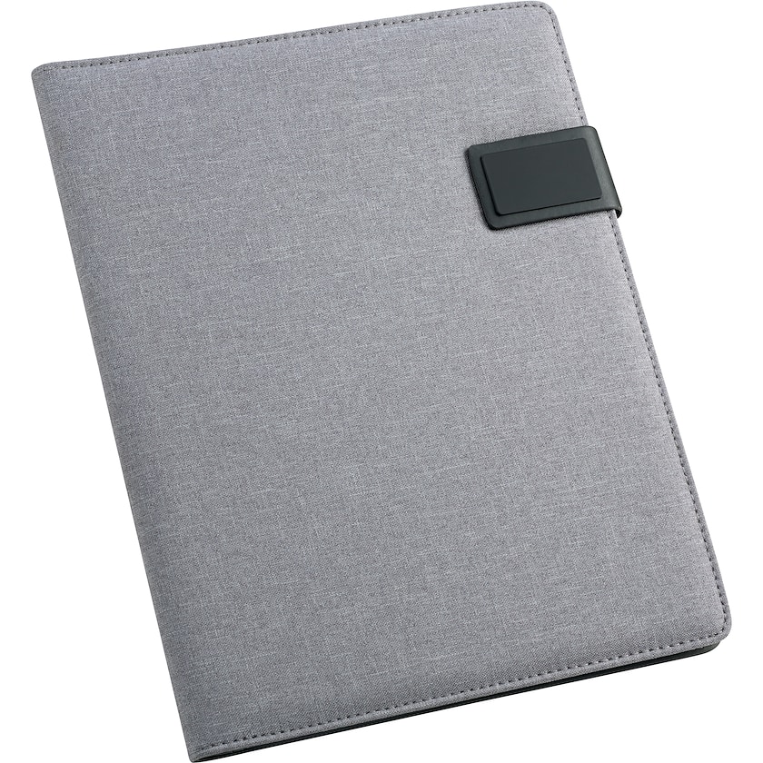 Konferensmapp i A4-storlek med omslag av tyg och konstläder. Mappen hålls stängd med ett magnetlås. Invändigt finns 20 linjerade blad. På framsidan finns en metallplatta med gummerad yta där lasergravyren sker. Penna ingår ej.