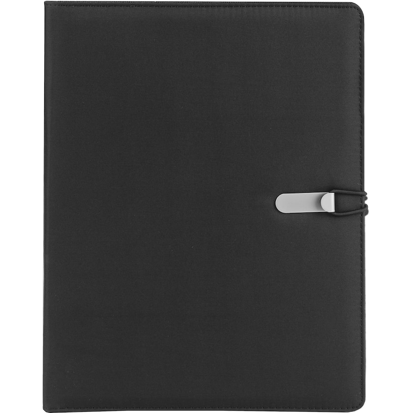 Modern konferensmapp i A4-format med en stor samt två mindre fickor. Mappen har plats för två USB-minnen och den stängs smidigt med en ögla runt en metallkrok.