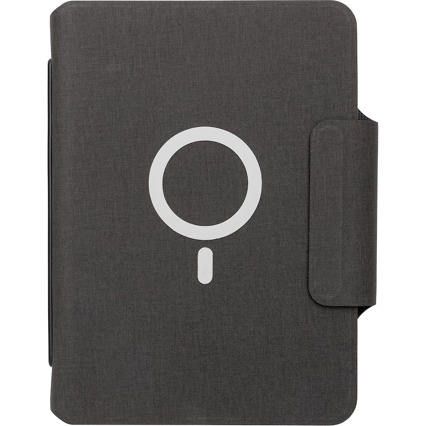 Konferensmapp med inbyggd 8000 mAh powerbank med trådlös laddning. Invändigt finns ett A4-block med 64 linjerade blad. Registrerad design. Levereras i en tjusig presentlåda.
