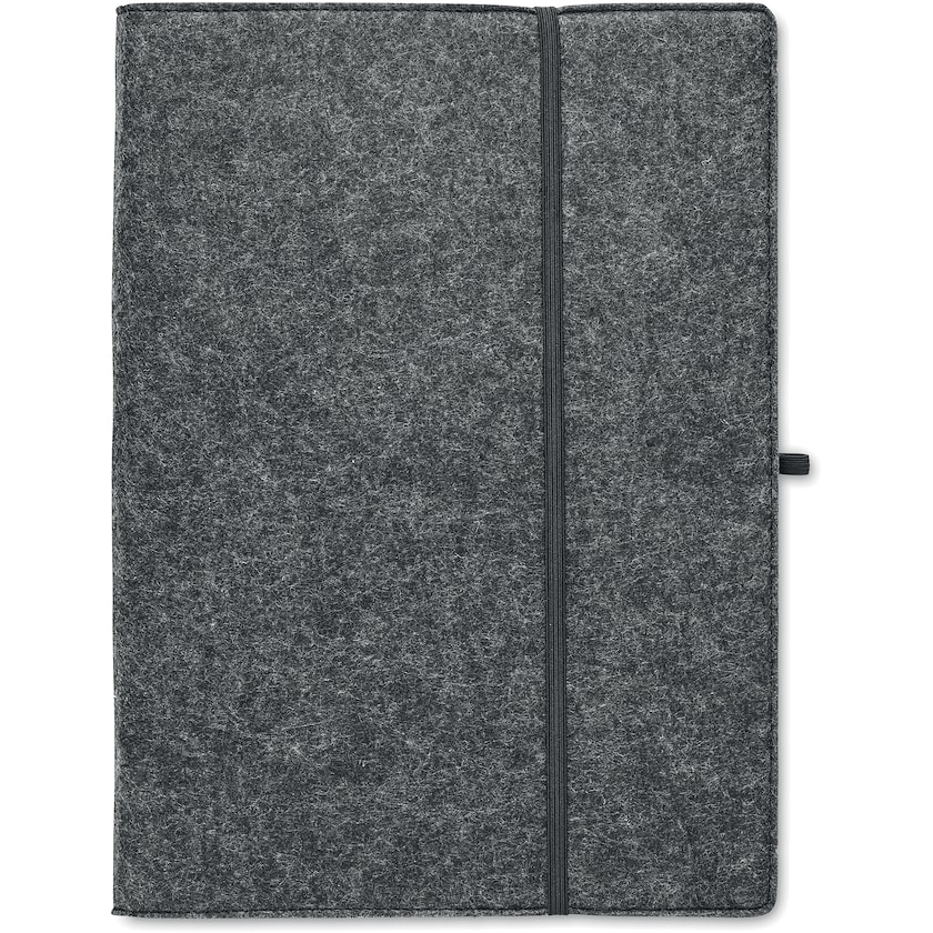 Konferensmapp med omslag av återvunnen filt. Invändigt finns pennhållare, flera fack samt ett anteckningsblock med 100 linjerade blad.