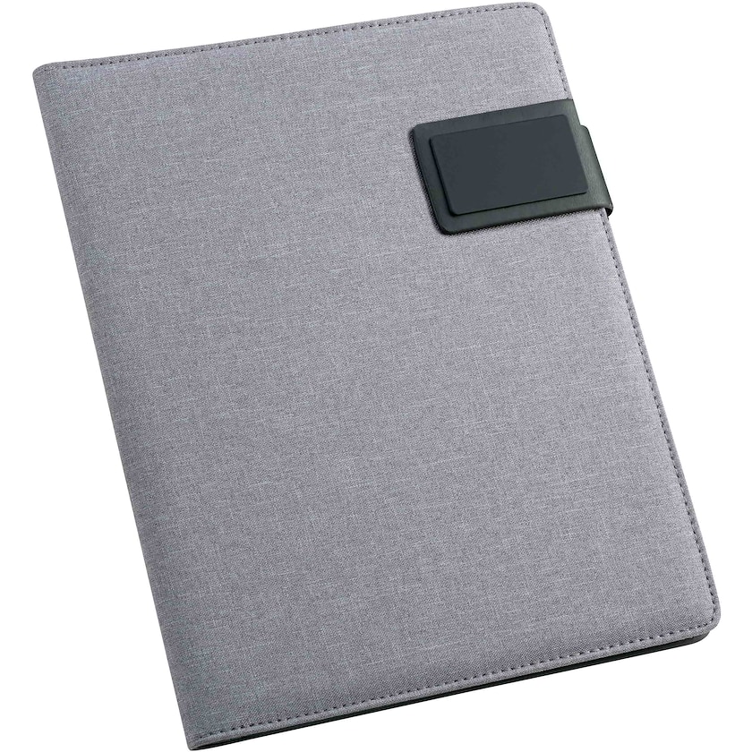 Konferensmapp i A5-storlek med utsida av tyg och konstläder. Mappen hålls stängd med hjälp av en magnet. Invändigt finns ett skrivblock med 20 linjerade blad. Lasergravyr sker på metallplattan på konferensmappens framsida. Penna och andra accessoarer medföljer ej.