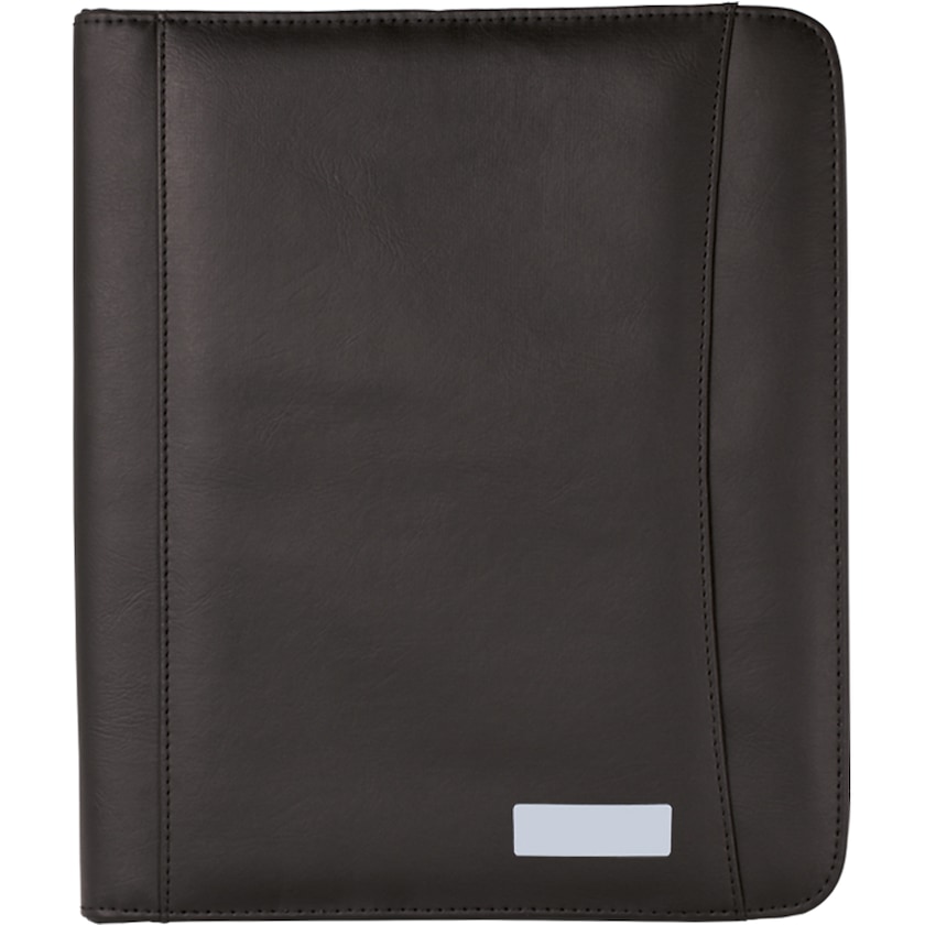 Konferensmapp av konstläder i A5-storlek. Invändigt finns en hållare för en iPad (eller en 9,7 tums surfplatta av annan typ). Ett linjerat skrivblock med 20 linjerade blad medföljer. Märkning sker med lasergravyr på metallplattan. Lasergravyren framträder i svart färg.