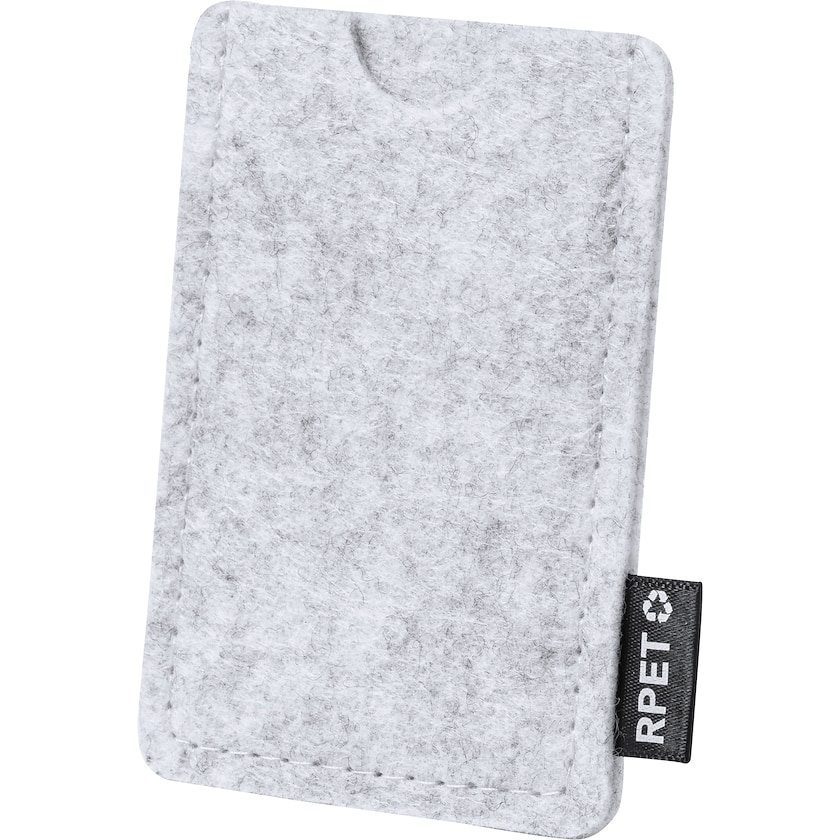 Kreditkortsfodral av filt av miljövänlig rPET. Kreditkortsfodralet har ett fack och på ena sidan finns en etikett som visar att den är gjord av rPET.