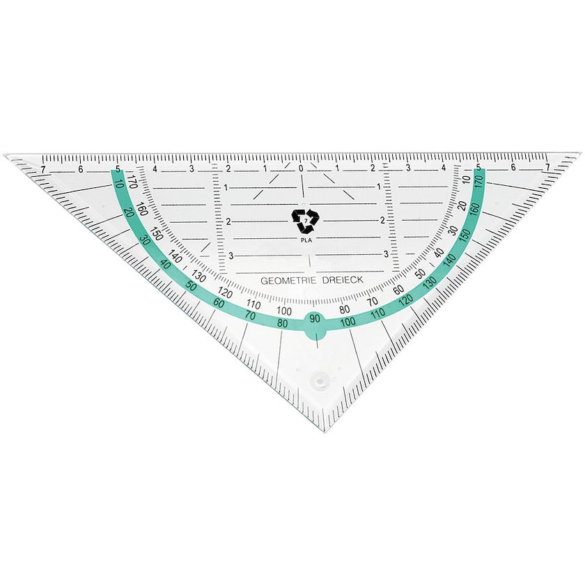 Miljövänlig triangulär linjal. Linjalen är tilverkav av bioplast och har en 14 cm skala samt en färgad skala för mätning av vinklar.