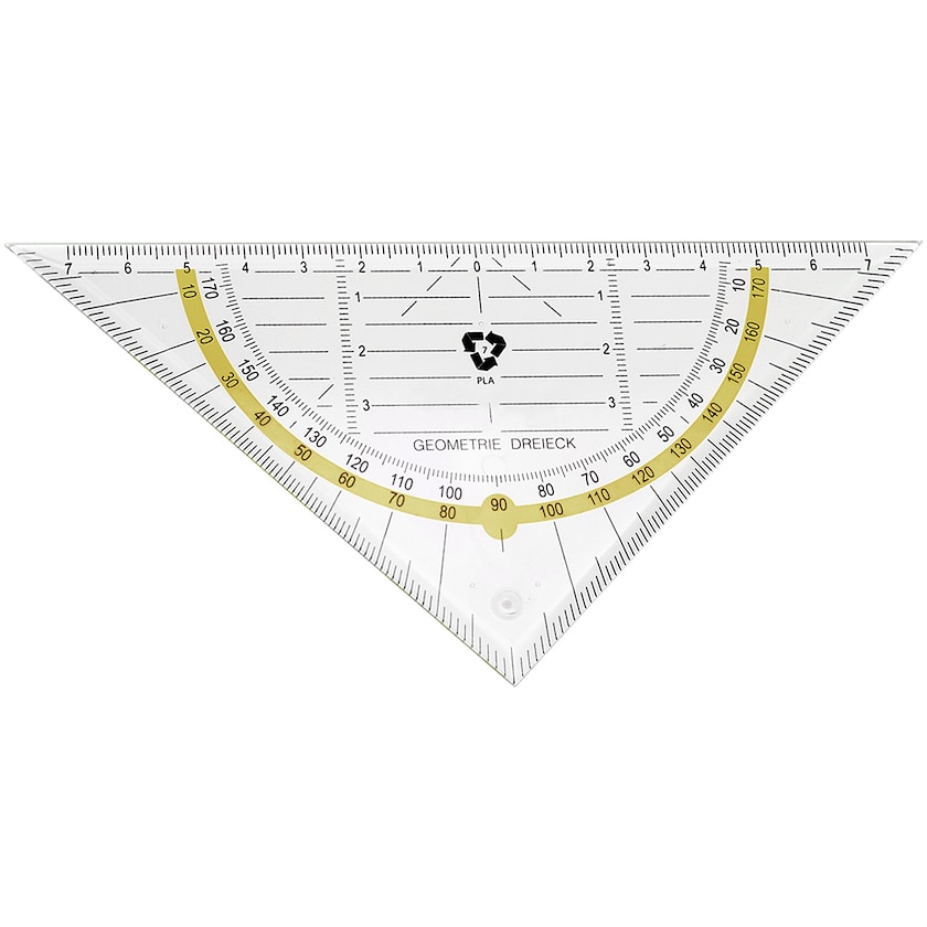 Triangulär linjal för avancerad mätning. Linjalen har en 14 cm skala samt en färgad skala för att mäta vinklar.