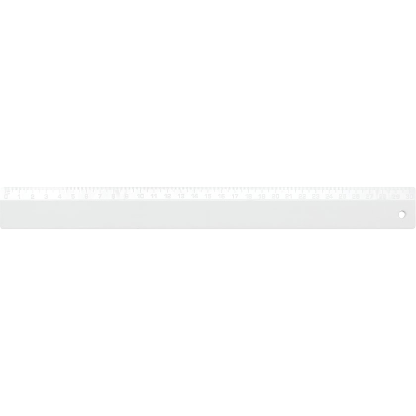 Vit linjal med eget tryck som mäter 30 cm. Måtten är gjutna in i plasten och riskerar därför inte att nötas bort.