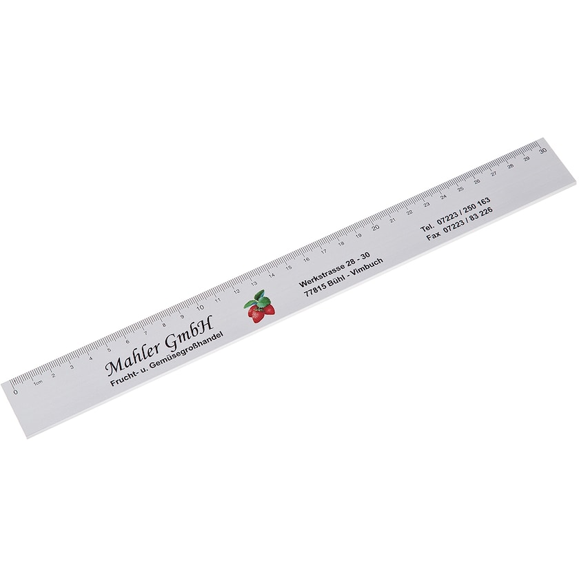 30 cm aluminiumlinjal av hög kvalitet. Linjalen är extra stabil tack vara profilränder på baksidan. Beställ aluminiumlinjaler med tryck hos Axon Profil!