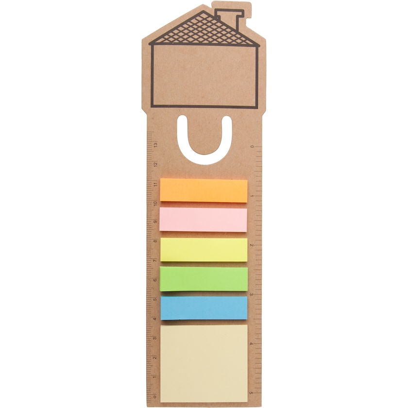 Märkflikar i med papperslinjal och husmotiv. Denna lekfulla produkt innehåller både färgglada märkflikar och notisblock. Perfekt för alla i fastighetsbranschen!