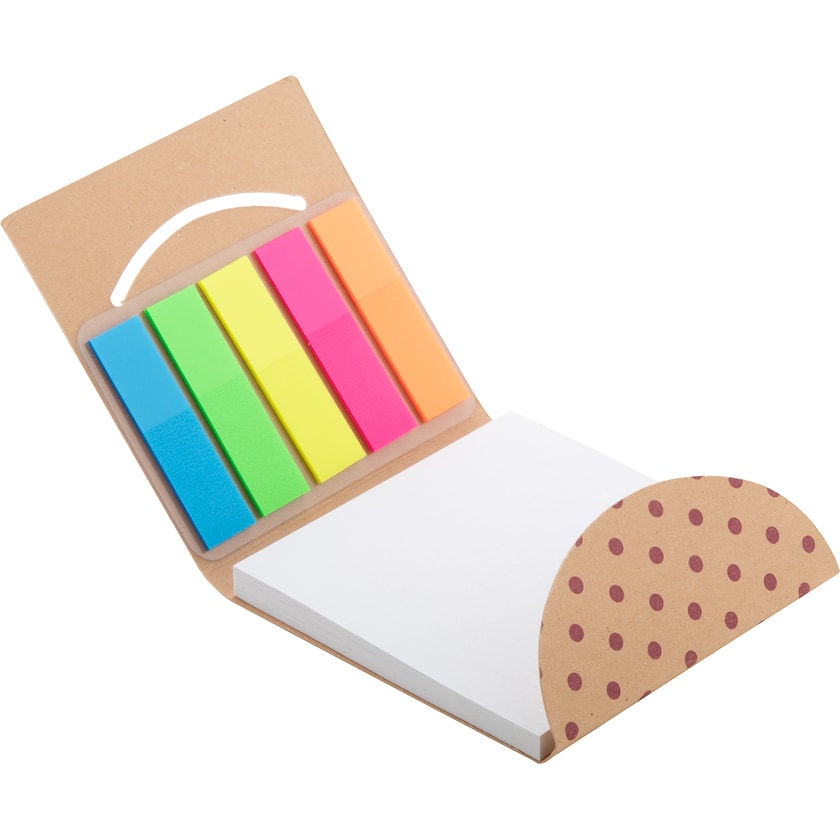 Miljövänligt hopvikbart set med märkflikar och notisblock. Märkflikarna är totalt 100 st fördelat på fem färger. Varje märkflik mäter 44 x 12 mm. Notisblocket mäter 75 x 75 mm och består av 50 blad med klister på ena sidan. Notisblocket samt omslaget är gjort av återvunnet papper.