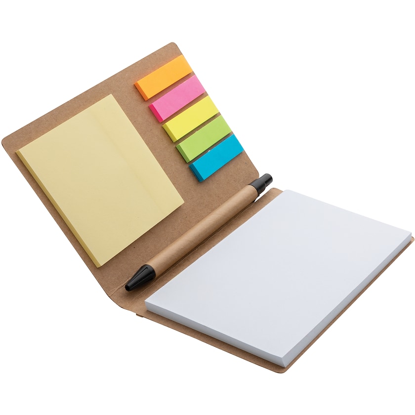 Set med märkflikar, notisar, ett anteckningsblock och en penna. Anteckningsblocket har 50 blad och märkflikarna och notisarna har vardera 25 blad. Pennan har blått bläck. Allt som behövs för en dags produktivt arbete!