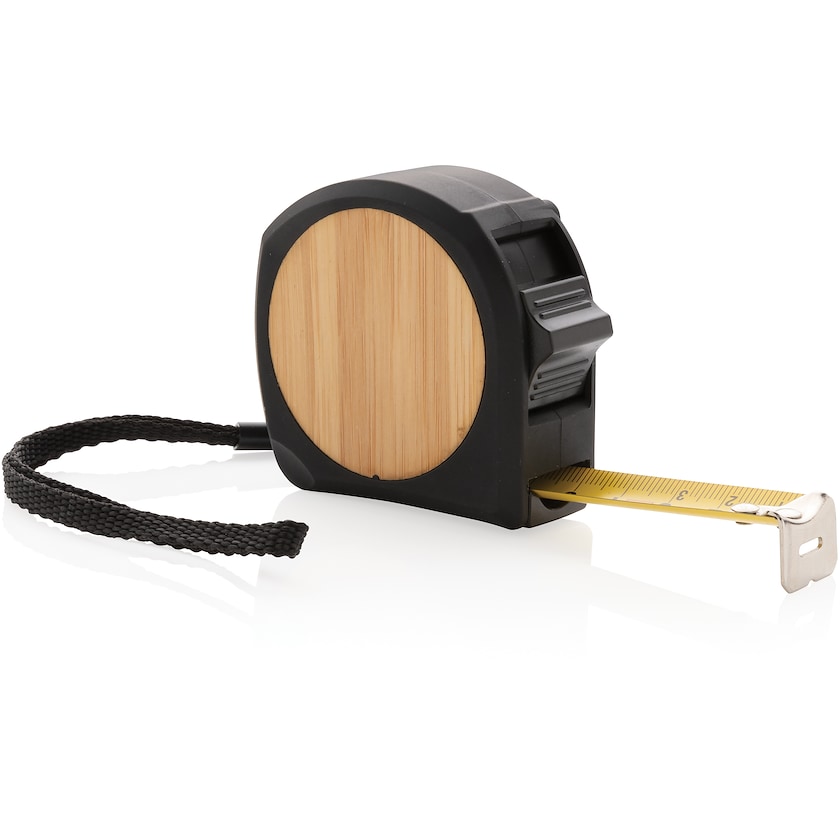 5-meters måttband med snygg detalj av äkta bambu. Måttbandet har stoppknapp och levereras i en snygg presentlåda. Märkning kan antingen ske med tryck eller lasergravyr.