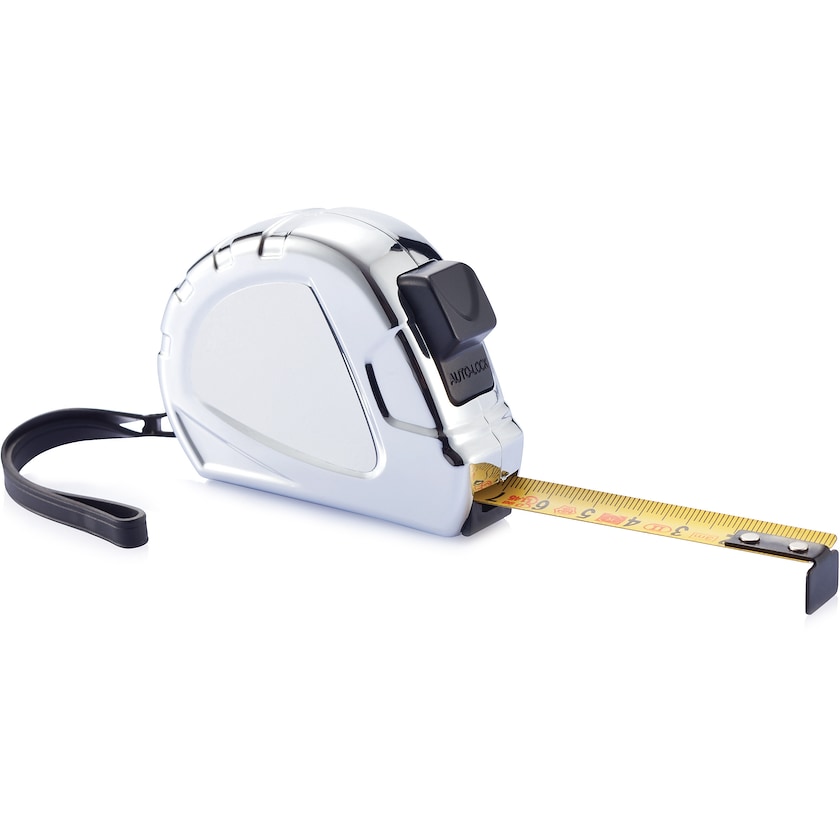 5-meters måttband med elegant, kromat hölje. Måttbandet har ett gult måttband i metall som uppfyller kraven i ECII. På baksidan finns ett bältesclips.