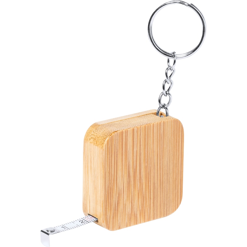 1-meters måttband med tryck eller lasergravyr. Måttbandet är tillverkad av bambu och är försedd med en nyckelring.