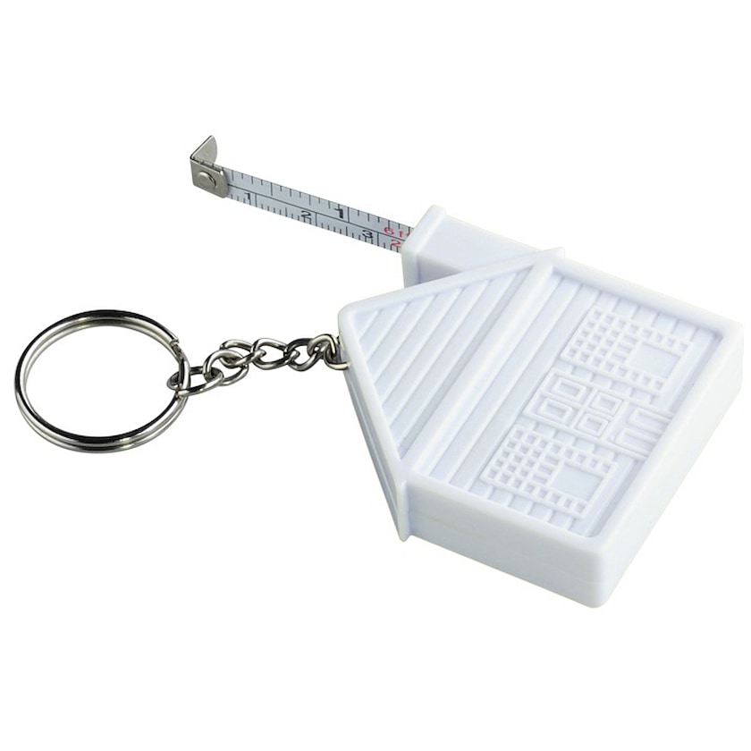 Kul 2-meters måttband i form av ett hus. Märkningen sker på husets baksida.
